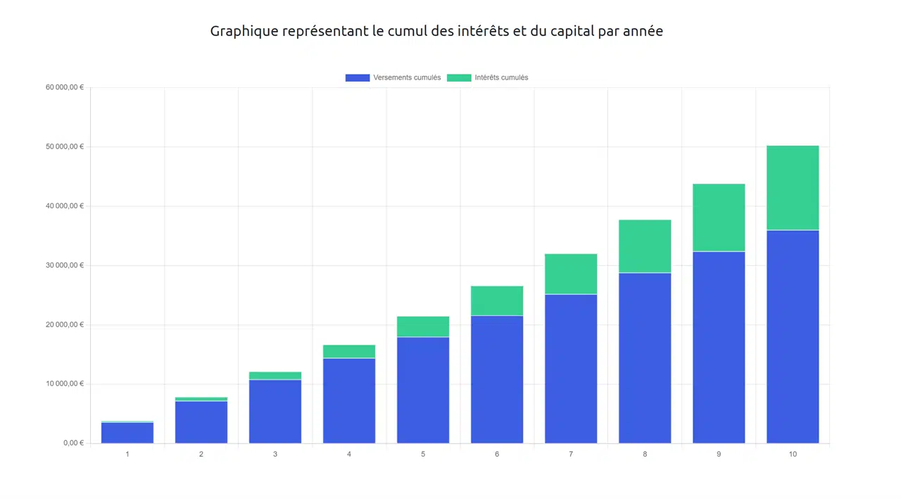 – Montant investi : 300 € par mois pendant 10 ans (soit 36 000 € au total).